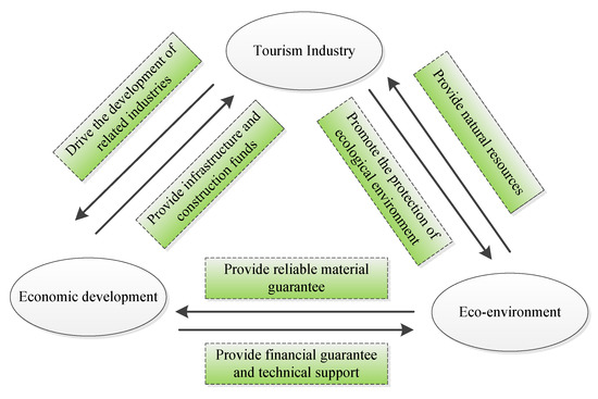 The tourism–economy–environment (TEE) system is an open construct with rich connotations, a complex structure, and coupling characteristics [6]. First, as a sunrise industry and comprehensive industry, tourism has become one of the fastest growing and rapidly developing industries in the 21st century. The rapid growth of tourism industry has driven the boom of the catering industry, commerce, the hotel industry, the transportation industry, and other related industries. It has also optimized the industrial structure, increased employment opportunities, and promoted economic growth [7,8]. Meanwhile, stable economic development has provided infrastructure and construction funds for tourism. Nevertheless, excessive and rapid development related to tourism damages the local environment and harms tourism economic growth, thus inhibiting tourism development in the long run [9]. Second, the eco-environment provides natural resources for tourism development. A sound eco-environment increases the attractiveness of the destination and improves tourist satisfaction. While the worsening of eco-environment leads to a decrease in environmental quality in tourist destinations, threatening the healthy development of tourism [10]. Finally, economic growth and the ecological environment are also interrelated. A sound eco-environment provides basic material guarantees for economic development, such as clean water, fresh air, and abundant energy. Economic development can provide financial guarantees and technical support for protection of the eco-environment. However, blindly pursuing economic interests results in the serious damage to eco-environment and exceeds the corresponding threshold [11,12], which affects the sustainable way of tourism development. In other words, there is a coupling relationship between the tourism industry, economic development, and eco-environment subsystems, as shown in Figure 1. Thus, it is theoretically and practically of great value to understand the coupled coordination relationship in the three subsystems, which not only provides a scientific basis for the sustainable and healthy development of tourism industry but is also conducive to coordinating socioeconomic growth and environmental improvement to achieve sustainable regional development.