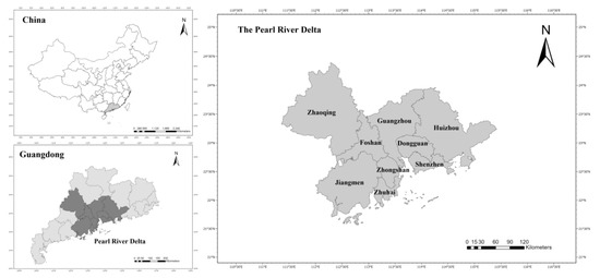 The PRD urban agglomeration is located in the south-central region of Guangdong Province, facing the South China Sea and adjacent to Hong Kong and Macao. It is one of the most dynamic economic regions in the Asia Pacific region. The PRD urban agglomeration includes nine cities: Guangzhou, Shenzhen, Foshan, Dongguan, Zhongshan, Zhuhai, Jiangmen, Zhaoqing, and Huizhou, ranging over a total area of 55,368.7 km2. It is one of the largest urban agglomerations in the world and one of the three regions with the strongest innovation capability, the largest population density and the highest comprehensive strength in China (Figure 2). In 2019, the permanent population of the PRD was 64.469 million, accounting for 4.6% of China’s total population, while the GDP of the PRD reached RMB 8.69 trillion, accounting for 8.8% of China’s GDP. The foreign exchange income of international tourism was USD 19.217 billion, accounting for 14.64% of China. Hence, the PRD is one of the regions with the most developed tourism economy in China. Compared with the Yangtze River Delta, Beijing–Tianjin–Hebei and other urban agglomerations, the PRD urban agglomeration formed an export-oriented economy by virtue of its regional advantages and preferential policies, quickly became the “world factory”, and therefore, experienced the most rapid urbanization since the reform and opening-up. Currently, the PRD, together with the Hong Kong Special Administrative Region (SAR) and the Macao SAR, has established the Guangdong–Hong Kong–Macao Greater Bay Area, one of the world’s four major harbor areas. Compared with the other three world-class bay areas, the Guangdong–Hong Kong–Macao Greater Bay Area has advantages in area, population, GDP, and scale and has huge development potential in per capita GDP, industrial structure and innovation ability. Due to limited data and inconsistent currency in Hong Kong and Macau SAR, this study chooses the PRD urban agglomeration as the research object, which is a major and vital part of the Guangdong–Hong Kong–Macao Greater Bay Area. In addition, the expansion of economic scale and the rapid development of tourism industry have led to environmental pollution. The TEE system of the PRD urban agglomeration is complex in structure and present strong coupling interactions, making it an area worth exploring.