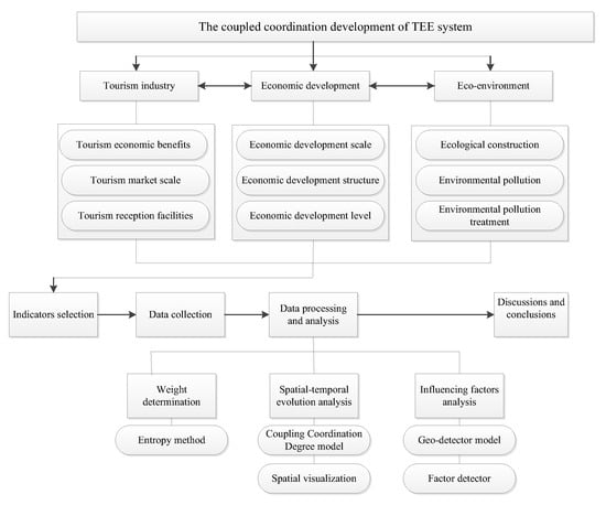 To research the coupled coordination relationship and evolution characteristics of the TEE system of the PRD urban agglomeration from 2010 to 2019, this study first constructs the indicators of the three subsystems and calculates the indicator weights. Then, based on the CCD model, the benefit index of the three subsystems and comprehensive benefit evaluation index of the TEE system and the CCD are analyzed from spatial and temporal dimensions. Additionally, the influencing factors of CCD are determined by the geo-detector model. Finally, we present a discussion and put forward relevant suggestions according to the results. The specific study framework and implementation steps are as follows (Figure 3).