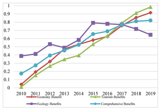 The weight coefficients of all indicators in the tourism industry, economic development and eco-environment systems in the PRD were obtained by using the entropy weight method, as shown in Table 1. Then, the benefit index of each subsystem and the comprehensive benefit evaluation index of TEE system in the PRD from 2010 to 2019 was calculated using the linear weighting method, as shown in Figure 4.