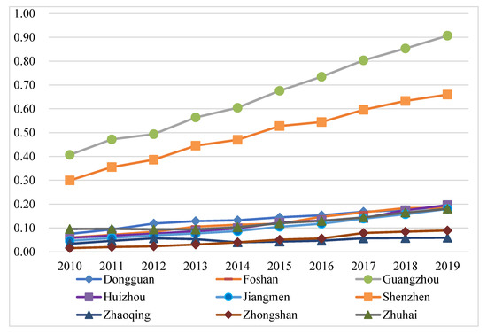 Tourism development in nine cities in the PRD generally increases, but there are significant regional differences (Figure 5 and Figure 6). Figure 5 shows that the tourism benefits of nine cities in the PRD can be divided into two development tiers. Guangzhou and Shenzhen are first-tier cities and their tourism development levels are far ahead of the other cities. The tourism benefits of these two cities were higher than 0.3 and showed an upward tendency from 2010 to 2019. The other seven cities are located in the second tier. The tourism benefits in these seven cities were relatively low during the study period, 0.2 or below. Although the tourism development of the second-tier cities shows an upward trend overall, the development level is far lower than that of the first-tier cities. The reason was that Guangzhou, as the central city in southern China and the most representative city of Lingnan culture area, not only has rich tourism resources and a long history, but also has excellent tourism facilities and services. Shenzhen’s tourism industry has strong marketing influence and tourism reception ability, attracting tourists with the charm of a modern city. However, the tourism development in the second-tier cities is still restricted by some factors. For example, Zhuhai is adjacent to Macao, with good air quality, livable climate, and beautiful coastal landscapes, and has been selected as one of the “Top 40 Tourist Resorts in China”, but there are problems such as imperfect public service facilities and tourism infrastructure. Dongguan has complete tourism development infrastructure, but lacks core cultural competitiveness and cultural heritage.