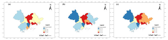 The benefit index of the tourism system in the PRD in (a) 2010, (b) 2014, and (c) 2019.