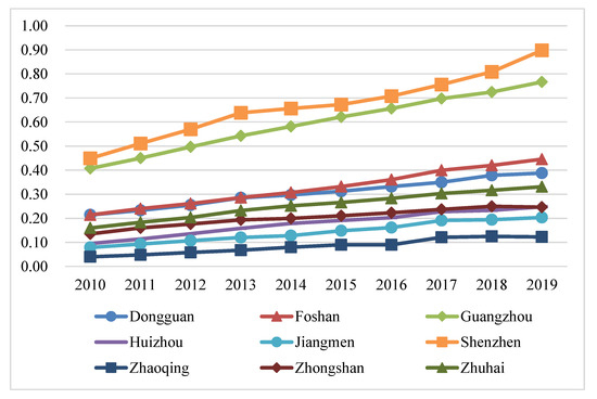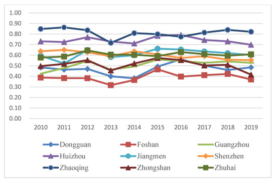 Therefore, the eco-environmental benefits in the PRD shows a fluctuating trend on the whole, indicating that the PRD has experienced an ecological deficit and environmental pollution problems resulted from the pursuit of rapid economic growth and urbanization expansion. The city governments in the PRD are paying increasing attention to eco-environmental protection and are gradually transitioning from the original extensive development mode at the expense of a healthy environment to the high-quality development mode characterized by low energy consumption and low levels of pollution.