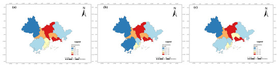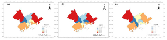 The benefit index of the eco-environment system in the PRD in (a) 2010, (b) 2014, and (c) 2019.