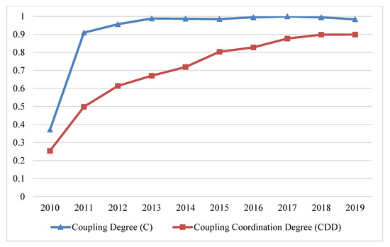 The benefit index of the tourism industry, economic development, and eco-environment subsystems of nine cities in the PRD from 2010 to 2019 were entered into the coupling degree and CCD calculation formulas (Formulas (10) and (11)) to gain the coupling degree and CCD of the TEE system (Table 4 and Figure 11).