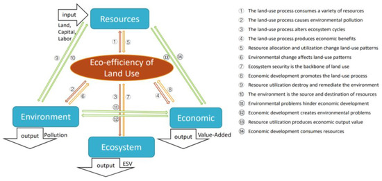 The evaluation of land-use eco-efficiency takes three basic production factors, land, capital, and labor as the input, and environmental pollution, ecosystem service value, and economic output value as the output. Focusing on the core of land-use eco-efficiency, it first expounds the impact and interaction mechanism of the land-use process on resources, environment, ecology, and economy. Secondly, the interaction between input and output factors is analyzed. Let us take the example of a city called S. In the process of the utilization of farming land, construction land, and other natural ecological land, S city in the urban agglomeration invests labor resources and capital, and finally produces ecosystem service value and economic output value, accompanied by certain environmental pollution. The environmental pollution caused by the process changes the land-use pattern, limiting economic development and industrial upgrading.