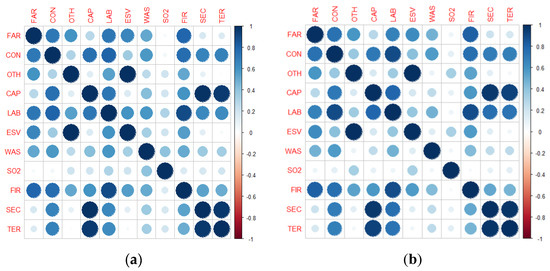 Correlation of inputs and outputs of 2015 (a) and 2020 (b).