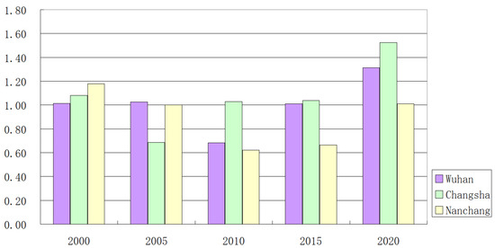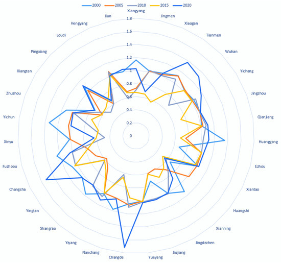 From the perspective of cities in Figure 6, the cities with the highest eco-efficiency of land use are, in order, Huanggang (2000), Tianmen (2005), Changde (2010), Changsha (2015), and Changde (2020), and the cities with the lowest eco-efficiency of land use are Loudi (2000), Yingtan (2005), Xinyu (2010) Huangshi (2015, 2020). During 2000-2005, most cities showed a decreasing trend, and the eco-efficiency of land use of Ezhou City increased the most from 0.67 to 1.03; the eco-efficiency of land use of Huanggang City decreased the most from 1.35 to 0.76. During 2005-2010, most cities showed an increasing trend, and the eco-efficiency of land use of Jingdezhen City increased the most from 0.57 to 1.01; the eco-efficiency of land use of Xinyu City decreased the most, from 1.00 to 0.47. From 2010 to 2015, most cities show a decreasing trend, with Wuhan City’s eco-efficiency of land use increasing the most from 0.68 to 1.00, and Xiaogan City’s eco-efficiency of land use decreasing the most from 1.00 to 0.56. From 2015 to 2020, most cities show an increasing trend. The eco-efficiency of land use in Changde City increased the most from 0.95 to 1.71, and the eco-efficiency of land use in Loudi City decreased the most from 0.73 to 0.66. Among the provincial capital cities, Changsha has a “U-shaped” trend with the highest mean value; Wuhan has a “V-shaped” trend with the second highest mean value; and Nanchang has a “W-shaped” trend with the lowest mean value. The provincial capital cities have bottlenecks regarding the problem of how to use land resources efficiently and ecologically, which will be improved to some extent in 2020 under a series of policy interventions and other influencing factors.