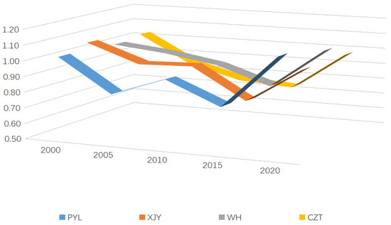 The variance between the four city groups of the MRYR urban agglomeration changed every year. In 2000, the highest average efficiency value is XJY, and the lowest is WH; In 2005, the highest is WH, and the lowest is PYL Circle. PYL and XJY experienced two ups and downs from 2000 to 2020 as they move along a “W-shaped” curve. WH and CZT show “U-shaped” curves, with higher land use eco-efficiency in 2000 and 2020, and lower land use eco-efficiency in 2005, 2010, and 2015.