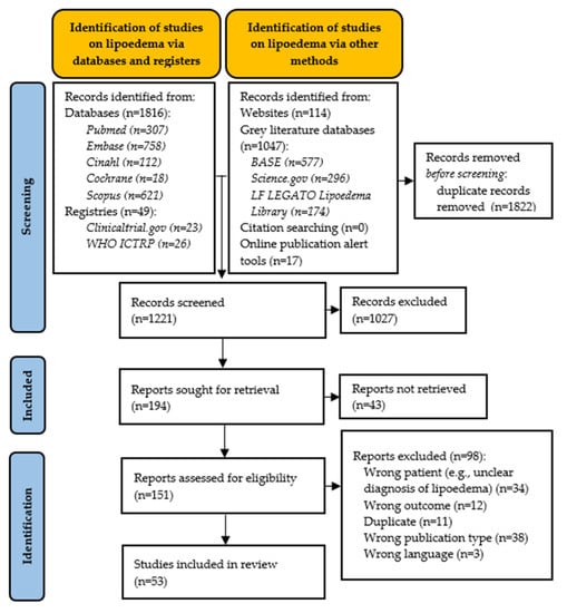Publications were gathered from PubMed, Cinahl, Embase, Cochrane, and Scopus to provide full coverage of the literature. The databases were initially searched for eligible publications on 21 February 2022 and an update was performed on 21 June 2022. After this update, the author received notifications of new publications via online publication alert tools based on an underlying saved search string. Study inclusion ended on 1 October 2022. Tailored search strings were built and reviewed by a librarian (Supplementary Table S1: Search strings). No limits or filters were used. The reference lists of the selected publications were searched for eligible publications to identify other relevant publications. In addition, databases of gray literature (Bielefeld Academic Search Engine (BASE), Science.gov, and the Lipoedema Foundation LEGATO Lipoedema Library), clinical trial registries (ClinicalTrials.gov and WHO International Clinical Trials Registry Platform), and conference reports and abstracts (Embase) were searched. Websites of specific organizations related to lipoedema (International Lipoedema Association, International Lymphoedema Framework, the Lipoedema Foundation, Wounds International) were also searched by hand for publications and gray literature.
