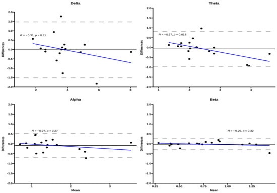 Bland–Altman plots for the EEG bands for the three exercise conditions. The Y-axis corresponds to the difference between inter-day measurements, the dashed gray lines correspond to the 95% LOA, and the black line corresponds to the bias. The blue line corresponds to the regression line between bias and the differences of repeated measures.