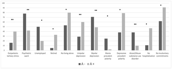 - Mazza, M.; Mandelli, L.; Di Nicola, M.; Harnic, D.; Catalano, V.; Tedeschi, D.; Martinotti, G.; Colombo, R.; Bria, P.; Serretti, A.; et al. Clinical features, response to treatment and functional outcome of bipolar disorder patients with and without co-occurring substance use disorder: 1-year follow-up. J. Affect. Disord. 2009, 115, 27–35. [Google Scholar] [CrossRef]