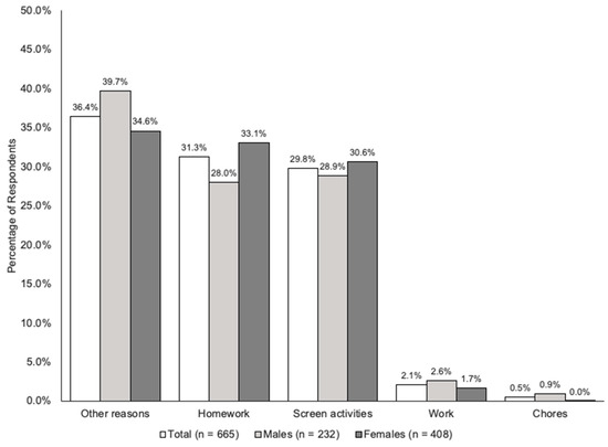 Although adolescents have a reputation for excessive sleeping, almost half the participants felt they did not get enough sleep regularly with fewer females than males regularly getting more than eight hours of sleep per night, and almost one in ten getting less than six hours. These results are consistent with other studies that have found higher sleep deprivation in adolescent girls [53]. Screen activities and homework were the most frequently reported reasons for poor sleep in this study, which is consistent with other reports [54]. Poor sleep habits in adolescents are associated with poor health outcomes and health behaviours including poor dietary choices [55].