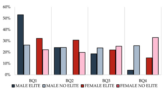 Considering female gender, the elite academies presented a greater number of early maturing players in the last BQs than not elite (BQ3 = 21.4% vs. 13.0%; BQ4 = 27.8% vs. 16.70%, respectively). However, elite academies showed a higher percentage of late maturity players in BQ2 (15.4% vs. 5.60%) and BQ3 (17.90% vs. 13.0%) than their nonelite counterparts.