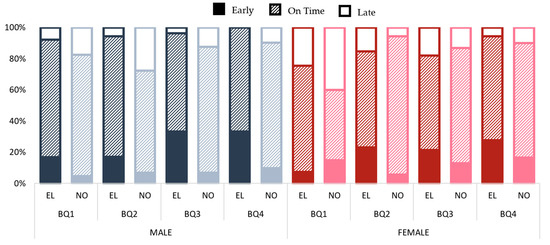 Maturity status distribution by birth quarter in elite and nonelite in male and female academies. EL = elite; NO = nonelite.