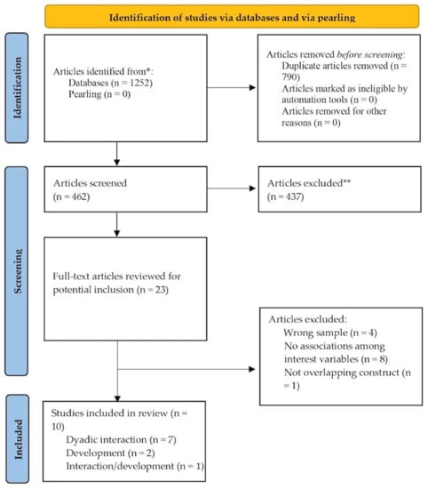 The PRISMA flow diagram displays the search strategy and study selection process of this systematic review (Figure 1). A total of 1252 articles were identified in all databases, being 462 of the available number after the exclusion of 790 duplicates. No studies were identified through pearling. Following the title and abstract assessment, 23 articles were selected. After the full-text analyses, 13 studies were excluded according to the eligibility criteria (see Appendix C), and a total of 10 articles were retained for this systematic review. Of the total, 7 articles focused on the impact of postnatal PND on dyadic relationships, 2 focused on the impact of postnatal PND on infant/toddler development, and 1 focused on the impact of postnatal PND on both dyadic relationships and infant/toddler development. For the description of the empirical design of the selected studies and information on the countries where they were conducted, see Table 1 and Table 2, respectively.