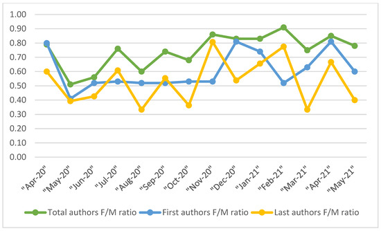 Evolution over time of the female/male (F/M) author ratio for total authors, first authors and last authors, April 2020–May 2021.