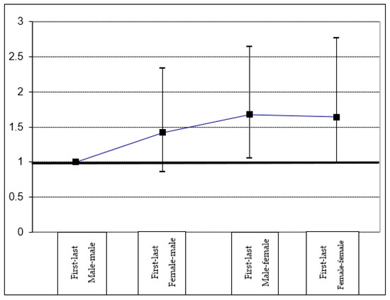 Odd ratios (95% confidence interval) of sex-disaggregation of results according to the combination of the sex of first and last authors.