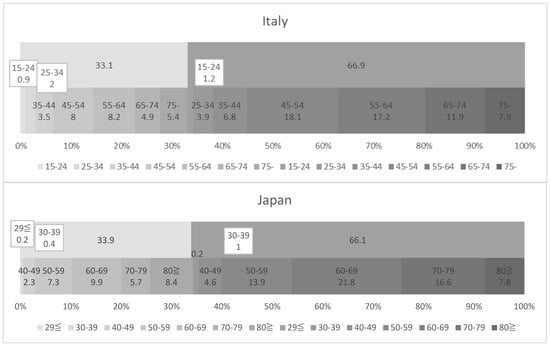 In contrast to EU member states in which comparable data on intrafamily care provisions and their sociocultural norms are covered by large-scale cross-national survey projects, such as SHARE and EUROFAMCARE, these kinds of projects and data sets are almost nonexistent between Italy and Japan. Although these limitations on comparative analysis must be taken into account, to clarify this question, this section provides a descriptive analysis by comparing the age groups of primary caregivers in Italy and Japan using their national surveys. For Italy, a national survey called “Health conditions and use of health services in Italy and in the European Union (Condizioni di salute e ricorso ai servizi sanitari in Italia e nell’Unione europea)” conducted by the Italian National Institute of Statistics (ISTAT) was used. This survey was a part of the European Health Interview Survey (EHIS), in which all EU member states participated. The EHIS was required by Commission Regulation (EU) No 141/2013 of 19 February 2013 (implementing Regulation (EC) No 1338/2008 of the European Parliament and of the Council on Community Statistics on Public Health and Health and Safety at Work) and included in the National Statistical Programme 2014–2016 (IST code 02565), with the aim of comparing the situation in different EU member states regarding the main aspects of the population’s health status and use of health services. The first edition of EHIS (that of Wave 1) was carried out between 2006 and 2009, but Italy did not participate in the survey and instead took part only in the second wave, in 2015. In Italy, the EHIS survey with the Italian title indicated above was carried out between October and December 2015. In the survey, there were 25 questionnaire items, one of which was “care or assistance provided (cure o assistenza fornite)”, which was used for this study. The survey was conducted in all regions across the country, with a sample size of 15,934 families and 29,210 individuals, and the total sample size of individuals who answered the questions on family care that was used in this study was 7293. For Japan, on the other hand, the Comprehensive Survey of Living Conditions conducted by the Ministry of Health, Labour and Welfare in June 2016 was used. This survey was launched in 1986, combining two surveys on welfare administration and national health launched in 1953 and two other surveys on national living conditions and health and hygiene launched successively in 1962 and 1963. In addition, in this survey, a large-scale survey is conducted every three years, and the survey related to long-term care that is used in this comparative study is included. Especially since the introduction of the long-term care insurance system in 2000, this large-scale survey has included more detailed surveys related to long-term care to clarify the basic conditions of family caregivers and older family members they care for. The survey was conducted in all prefectures across the country except for one prefecture where a Designated Disaster of Extreme Severity occurred in 2016, with a sample size of 224,208 for the questionnaire on households and health, and the total sample size of individuals who answered the questions on long-term care that is used in this study was 6790.