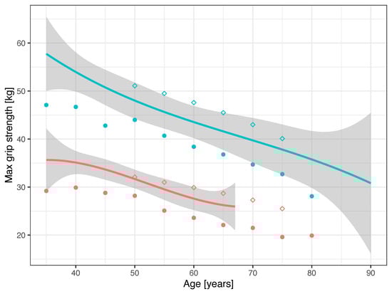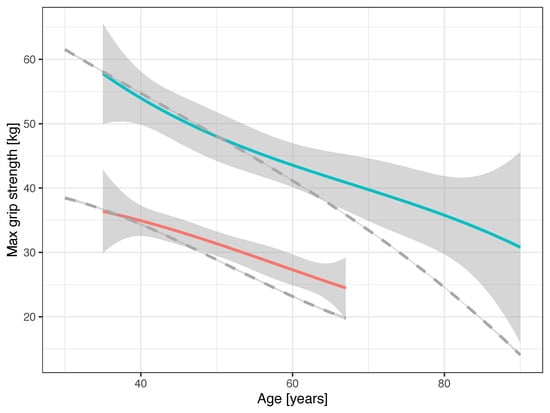 - Huebner, M.; Lawrence, F.; Lusa, L. Sex Differences in Age-Associated Rate of Decline in Grip Strength When Engaging in Vigorous Physical Activity. Int. J. Environ. Res. Public Health 2022, 19, 11009. [Google Scholar] [CrossRef]