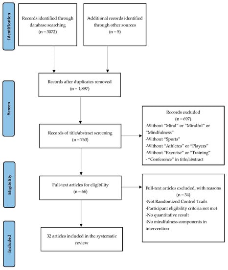 The current systematic review and meta-analysis were conducted following the Preferred Reporting Items for Systematic Review and Meta-Analyses (PRISMA) guidelines (Supplementary Materials); the review protocol has been prospectively registered on PROSPERO (CRD42022299940). Based on a predefined literature search strategy, the following five electronic databases were searched using Boolean logic’s multi-filed search format with no limit to the date range: Web of Science, PubMed, Scopus, ProQuest, and ScienceDirect. In addition, the reference lists of relevant review papers were also checked. We combined three groups of keywords in the search: (1) mindfulness; (2) sport* OR athlete* OR player* OR athletic* OR exercise* OR training; and (3) performance OR achievement. The literature search was limited to human participants and the publication language was limited to English.