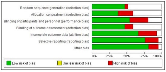 For the risk of bias assessment, 71% of the included studies had a low risk of bias, while six studies (29%) were rated as a high risk of bias. Most studies showed a high risk of bias with respect to the allocation concealment (22%), blinding of participants and personnel (29%), incomplete outcome data (29%), and selective reporting (19%) (Figure 2).