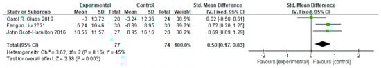 Three studies were included in the meta-analysis and a significant moderate effect size was yielded (d = 0.50, 95% CI = [0.17, 0.83], p = 0.003). There was a from low to moderate heterogeneity among the included studies (I² = 45%, p = 0.16). (Figure 3).
