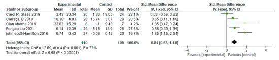 Five studies were included in the meta-analysis, showing a large effect size of mindfulness interventions on the psychological components of athletes (d = 0.81, 95% CI = [0.53, 1.10], p < 0.001). There was high heterogeneity among included studies (I² = 77%, p = 0.001) (Figure 4).