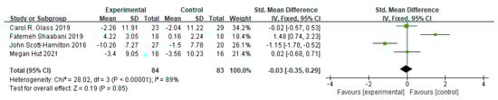Four studies were included in the meta-analysis (Figure 5), which showed that there was no significant effect of MBI on mental health among athletes (d = −0.03, 95% CI = [−0.35, 0.29], p = 0.85). There was high heterogeneity among the studies (I² = 89%, p < 0.001).