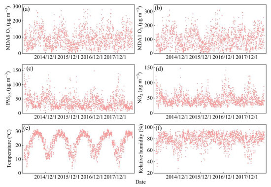 Notably, PM2.5 and NO2 concentrations were higher in the cold season, whereas O3 was higher in the warm season. The daily concentration range of MDA8 O3 and MDA1 O3 during the study period (2014–2018) were 4.0–271.0 and 4.3–311.1 μg/m3, respectively. The daily concentration of NO2 was in the range of 14.0–148.0 μg/m3, with an annual average of 46.1 μg/m3. During the study period, NO2 exceeded the level II of the Chinese Ambient Air Quality Standards (40 μg/m3) for 963 days, accounting for 54.93% of the total number of days. The annual average value of PM2.5 was 38.2 μg/m3, which was 46.8% higher than the 35 μg/m3 threshold recommended by the level II of the Chinese Ambient Air Quality Standards, and it was 99.0% higher than the annual average reported by the WHO (10 μg/m3). Moreover, the daily average temperature and relative humidity ranged from 3.3 °C to 31.7 °C (annual average was 22.2 °C) and from 28% to 97% (annual average was 78.7%), respectively, which were included in the model as confounding factors. Figure 1 shows the temporal evolution of the four pollutants and the two meteorological factors.