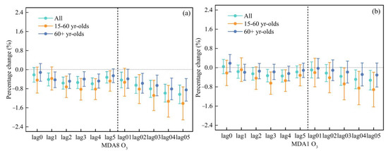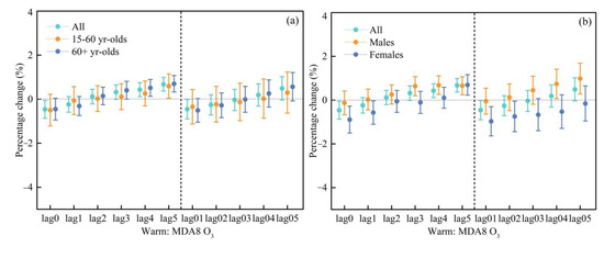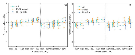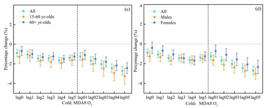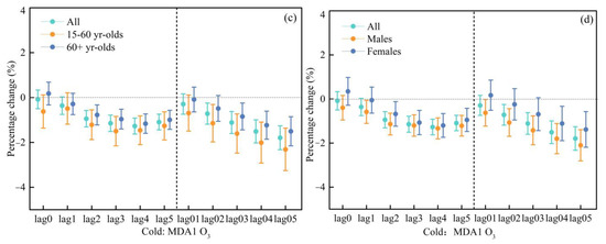 The risk of cardiovascular hospital admissions in different age groups was further examined by applying the same model to determine whether there were differences between age groups. As shown in Figure S1a, MDA8 O3 was negatively related to cardiovascular hospital admissions. At the lag of five days, the effect of MDA8 O3 on cardiovascular hospital admissions in the 15–60 years age group was the highest and significant, with an OR value of 0.9999 (95% CI: 0.9952, 0.9909). The highest OR value at the day of lag3 was significant for the 60+ years age group, with an OR value of 0.9960 (95% CI: 0.9929, 0.9991).