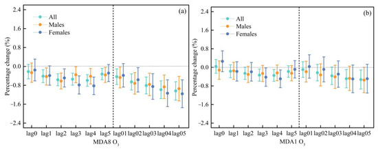 For MDA1 O3, no significant association was found for the male group. Meanwhile, for the female group, significant associations were found at the days of lag3 and lag4, with OR values of 0.9958 (95% CI: 0.9918, 0.9997) and 0.9951 (95% CI: 0.9913, 0.9989), respectively (Figure S2b). Figure 3 shows the percentage change in cardiovascular hospital admissions with an IQR increase in MDA8 O3 and MDA1 O3 for different gender people.
