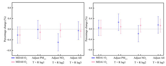 Sensitivity analyses demonstrated that these results are stable by implementing the single- and multi-pollutant model. In the multi-pollutant model analysis, after PM2.5 was added, the OR values of different O3 indicators decreased slightly, but still without statistical significance (purple color in Figure 6). For the MDA8 O3, after adding NO2 or adding PM2.5 and NO2 simultaneously, the change in the effect of O3 on cardiovascular hospital admissions was small, with OR values of −0.0312%, −0.0015%, −0.0698%, and −0.0078%, respectively. For MDA1 O3, the values were 0.0049%, 0.0297%, −0.0207, and 0.0178, respectively (purple color in Figure 6).