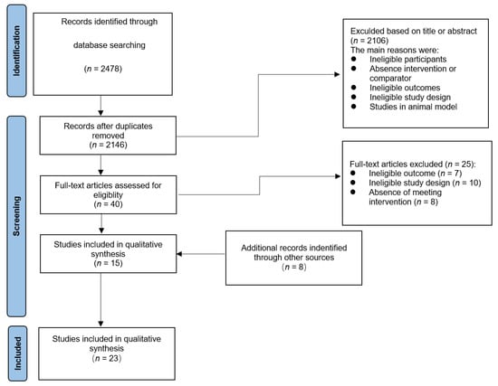 The results of the search are shown in Figure 1. A total of 2478 papers were retrieved by searching the PubMed, Web of Science, and EMBASE databases; 48 papers were obtained after removing duplicates, animal experiments, non-randomized controlled experiments, and experimental papers that did not meet the inclusion criteria. After reading the full text of the literature of these 48 papers, 15 papers were retrieved in the end. By reading the meta-analysis of other researchers, 8 additional papers were included after a three-person discussion, and finally 23 RCT studies were included.