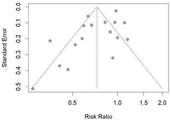 Funnel plot based on study standard error and risk ratio in assessing publication bias.