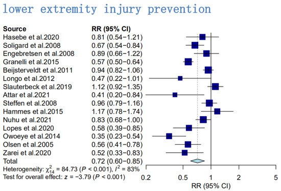 Lower extremity injury is a dichotomous variable, and this paper uses the risk ratio (RR), which is the incidence of injury in the intervention group vis-à-vis incidence of injury in the control group with 95% confidence interval as the combined effect size. If RR = 1, it implies that the intervention group is different from the control group; if RR > 1, it indicates that the intervention is harmful to the subjects; if RR < 1, it indicates that the intervention has a positive effect on the prevention of lower limb injuries; and the lower the RR value, the greater is the effectiveness of the intervention.