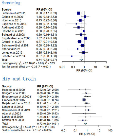 Secondary analyses of injury rates in hamstring eccentric exercise prevention programs, compared with control intervention for the following specific body regions: hamstring and hip and groin [4,5,18,19,22,27,39,40,41,42,43,44,45,46,47].