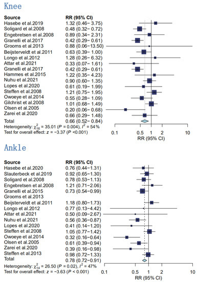 Fifteen papers with a total of 14,273 subjects were included, and the results of the analysis (Figure 6) showed low heterogeneity between the papers, with I2 = 47%, using a fixed-effects model [4,5,18,19,22,27,39,40,41,44,45,46,47,55,58]. Thus, programs that included hamstring eccentric training were effective in preventing ankle injuries in the athletic population (RR = 0.78). The results of the analysis were statistically significant (p = 0.006).