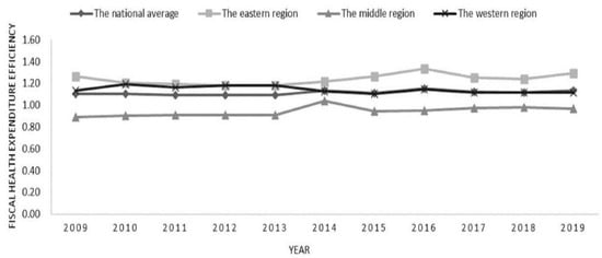 Changes in the fiscal health expenditure efficiency by region in China from 2009 to 2019.