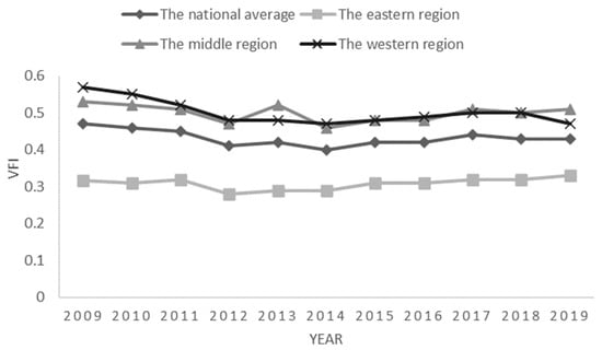 Change of vertical fiscal imbalance in China by region from 2009 to 2019.