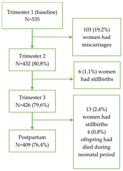 Flow chart of women who were followed up from the first trimester to postpartum and reasons for exclusion.