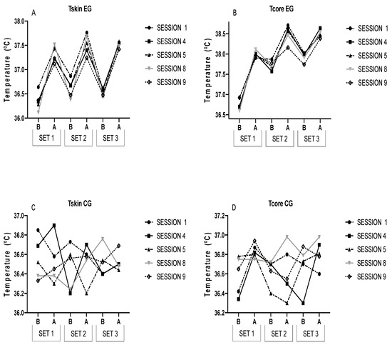 Tcore is higher at the beginning of S1 and S9 compared to S8 (p < 0.05). The subsequent Tcore to set 2 in S9 is lower than in S4 (p < 0.05), whereas the prior one to set 3 in S3 is inferior to that in S1 (p < 0.05). A higher Tskin was discovered at the beginning of S1 with respect to S5 (p < 0.05), S8 (p < 0.01), and S9 (p < 0.05). Likewise, previously to set 2 in S9, Tskin was massively minor than in S1 (p < 0.05). There were noteworthy differences between Tskin before and after comparison to S4 (p < 0.05).