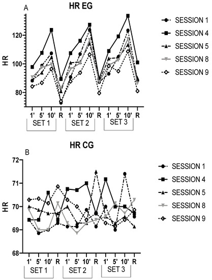 This figure shows the HR during each session in the EG (A) and the CG (B). R = Recovery. 1′ = minute 1; 5′ = minute 1; 10′ = minute 10.