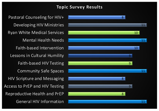We held seven organizing committee meetings over six months (Table 1). This core group guided the process by setting goals, deciding deliverables, and establishing a feasible timeline to host the virtual faith summit successfully. Session topics were narrowed down from an original list of 20 to the top 12 by our organizing committee. The topics “Developing HIV Ministries, General HIV Information, Mental Health Needs, and Community Safe Spaces” held the highest number of votes and were combined/collapsed to the following three: (1) General HIV Information, (2) Impact of Poverty on HIV, and (3) Faith Community’s Response (Figure 1).