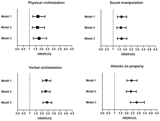 Figure 2 shows the crude and each model’s adjusted ORs for various kinds of bullying victimization (physical victimization, social manipulation, verbal victimization, property attacks) before and during the pandemic. The rates of all bullying victimization were higher during the pandemic than before the pandemic. The crude and model adjusted ORs for physical victimization, social manipulation, verbal victimization and property attacks were, respectively, as follows: crude OR: 1.698, 95% CI: 1.263–2.283, p < 0.001; model 2 adjusted OR: 1.665, 95% CI: 1.237–2.241, p < 0.001; model 3 adjusted OR: 1.788, 95% CI: 1.324–2.413, p < 0.001; crude OR: 1.688, 95% CI: 1.343–2.12, p < 0.001; model 2 adjusted OR: 1.641, 95% CI: 1.305–2.063, p < 0.001; model 3 adjusted OR: 1.693, 95% CI: 1.344–2.133, p < 0.001; crude OR: 2.361, 95% CI: 2.038–2.733, p < 0.001; model 2 adjusted OR: 2.307, 95% CI: 1.989–2.676, p < 0.001; model 3 adjusted OR: 2.417, 95% CI: 2.074–2.817, p < 0.001; crude OR: 2.398, 95% CI: 2.014–2.854, p < 0.001; model 2 adjusted OR: 2.344, 95% CI: 1.966–2.795, p < 0.001; model 3 adjusted OR: 2.818, 95% CI: 2.292–3.464, p < 0.001. The incidence of property attacks increased the most.