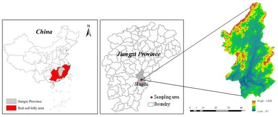 Soil samples were collected in Ningdu County (115°40′20″–116°17′15″ E, 26°05′18″–27°08′13″ N), which is located in the middle and low mountainous hilly area in southeastern Jiangxi Province, China (Figure 1). The study area experiences a humid mid-subtropical monsoon climate, with a mean annual precipitation of 1706 mm, and with 40–70% of the total precipitation mainly occurring from April to June. The average annual temperature is 14–19 °C, with an annual sunshine hour of 1938.8 h. The landscape of the area is dominated by hills and mountains. The rocks are mostly granite, and the red soil formed by the weathering of granite is widely distributed here. The whole soil layer has a large amount of quartz sand and gravel, with rough texture, low fertility, and strong permeability, being a serious soil erosion area in Jiangxi Province. The topography and soil conditions are typical of the granite region of southeastern China.