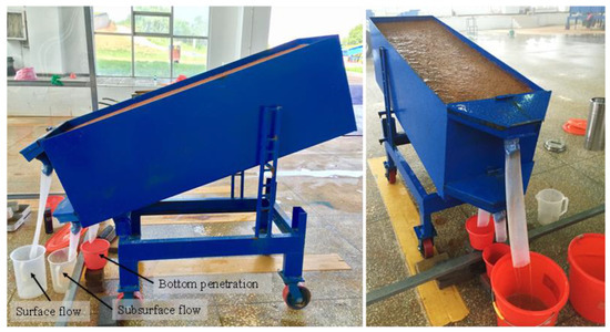 As shown in Figure 2, the surface flow and sediment samples were converged through the “V-shape” outlets at the front part of the soil flume, which was linked with the collection device. At the bottom of the soil plot, the water outlet was set as a square of 5 cm to ensure free infiltration during the rainfall. Bottom penetration water was collected through the splicing plate. A 10 cm wide slit was opened under the front baffle of the soil plot, and a gauze was fixed with glue inside of slit to ensure soil particles would not leak out during the soil-filling and rainfall processes. A water pipe with a valve was installed outside of slit to lead out subsurface flow, which was connected with the bucket to collect subsurface flow.