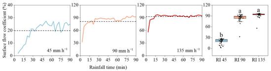 The surface flow coefficients increased significantly with increasing rainfall intensities. At 45 mm h−1 rainfall, the initial surface flow coefficient was only 1.95%, while the values were 32.49% and 55.97% at 90 and 135 mm h−1 rainfall intensities, respectively. Moreover, the peak value also increased from 27.36% under 45 mm h−1 to 97.13% under 135 mm h−1 rainfall. For the mean surface flow coefficient, it was only 19.87% at 45 mm h−1 rainfall and increased to 83.84% and 92.42% at 90 and 135 mm h−1 rainfall intensities, respectively.