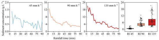 The sediment concentrations increased significantly with increasing rainfall intensities. At 45 mm h−1 rainfall, the initial sediment concentration was only 1.39 g L−1, which was greatly lower than 12.59 and 21.16 g L−1 at 90 and 135 mm h−1, respectively. Moreover, for the average sediment concentration, this value increased from 0.62 g L−1 at 45 mm h−1 to 4.80 and 7.70 g L−1 under 90 and 135 mm h−1 rainfall events, respectively.