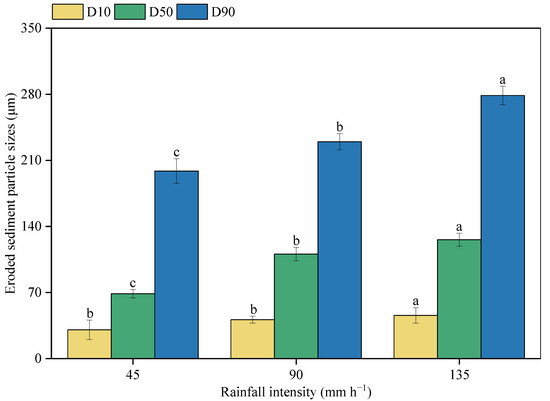 The size distributions of the eroded sediments under different rainfall intensities. Note: D10, D50, and D90 were the corresponding particle sizes when the cumulative particle size distribution of the sediment samples reached 10%, 50%, and 90%. The different letters indicate significant differences among different rainfall intensities (p < 0.05).
